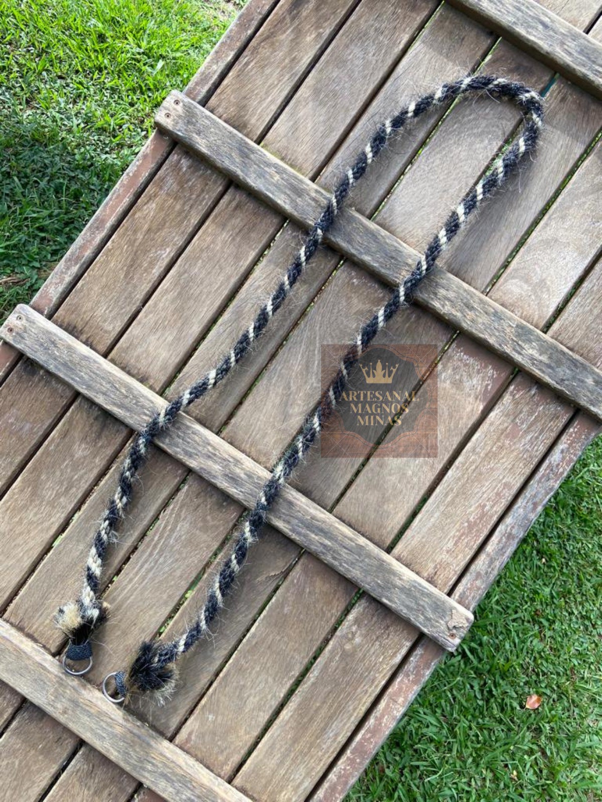 - Rédea grossa de crina, confeccionada com cabelos naturais de equinos, trançado, altamente resistente, com argolas em INOX;